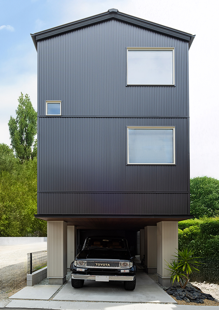 ガレージ部分に“門型フレーム”を採用し、開放的な車庫とアプローチを実現しました。