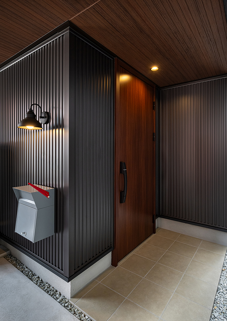 アプローチの木調軒天とメタルサイディングのコンビネーションがモダンな雰囲気を演出します。