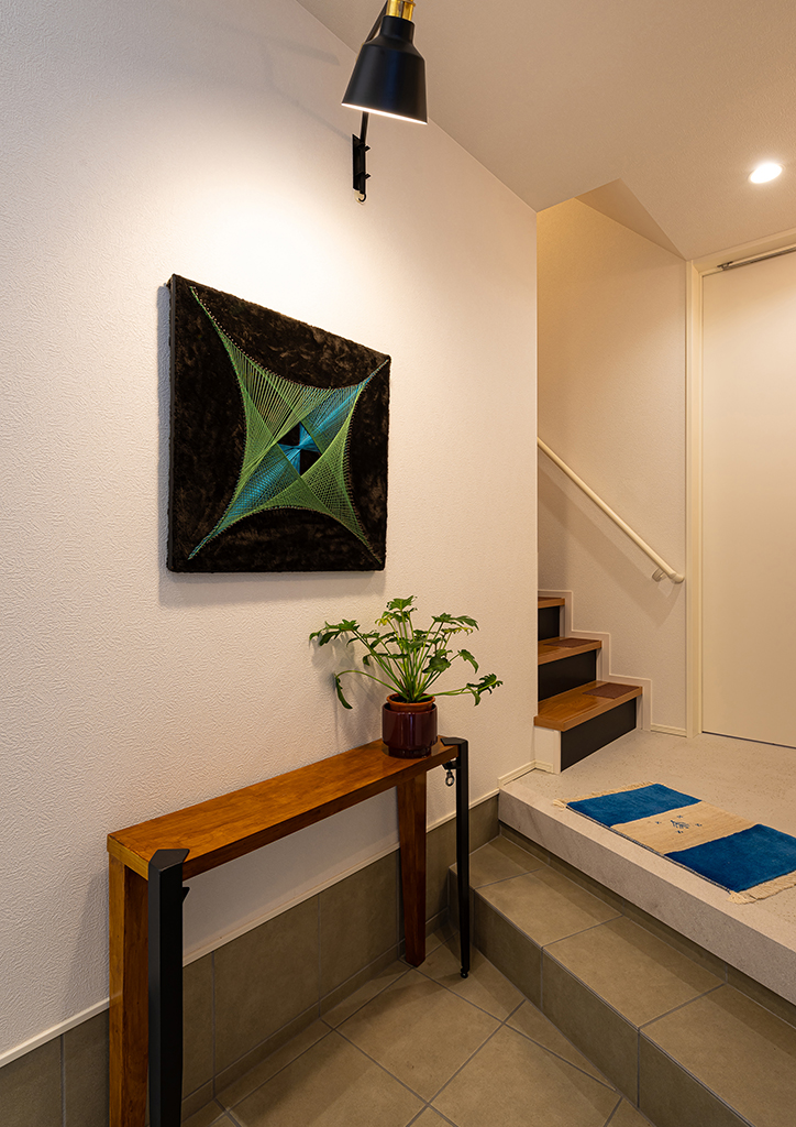 シンプルな玄関ホールに、施主様が選び抜いたこだわりのアートやインテリアが美しく映えます。
