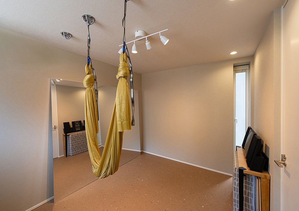 1階にはエアリアルヨガのハンモックを設置したトレーニングルームも設けました。