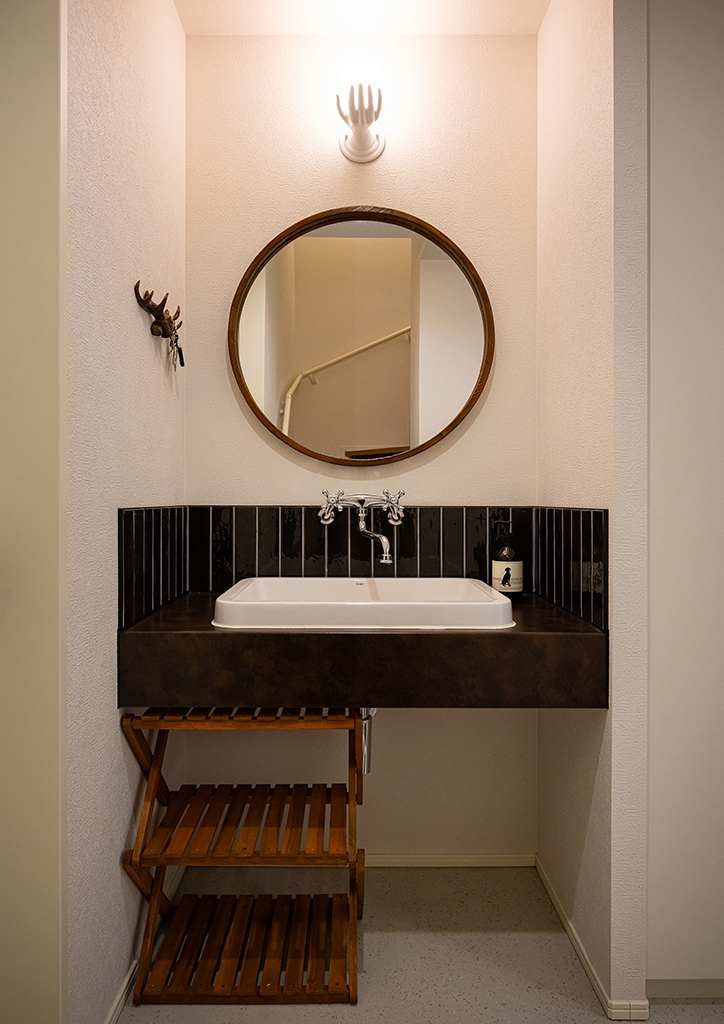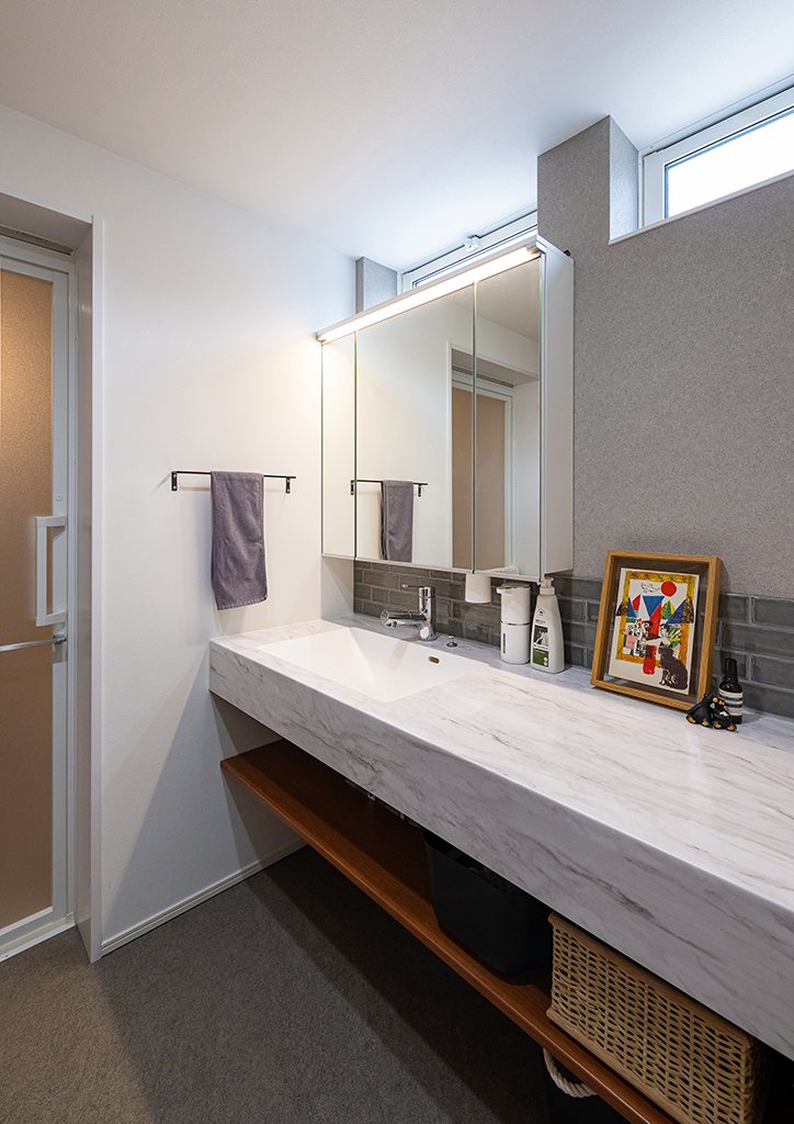 2階にはホテルライクな洗面・浴室を配置。洗面台上部の窓から自然光を取り入れ、静謐な中にも明るさを持った空間設計です。