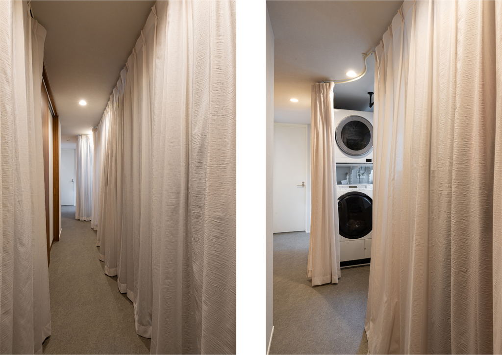 美しいカーテンで仕切られた廊下。カーテンの向こうにはスムーズで理想的な動線「ランドリールームからそのまま収納できるクローゼットへ、ひと続きのスペース」が隠されています。