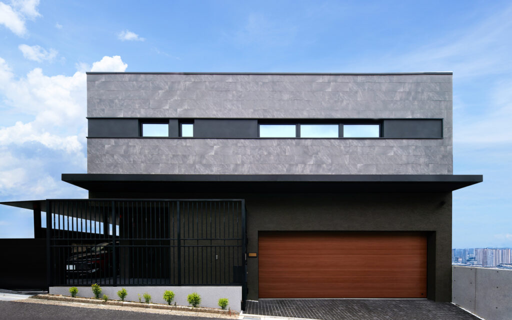 グレートーンでまとめたシンプルなデザインに、ガレージシャッターの木目調がアクセント。