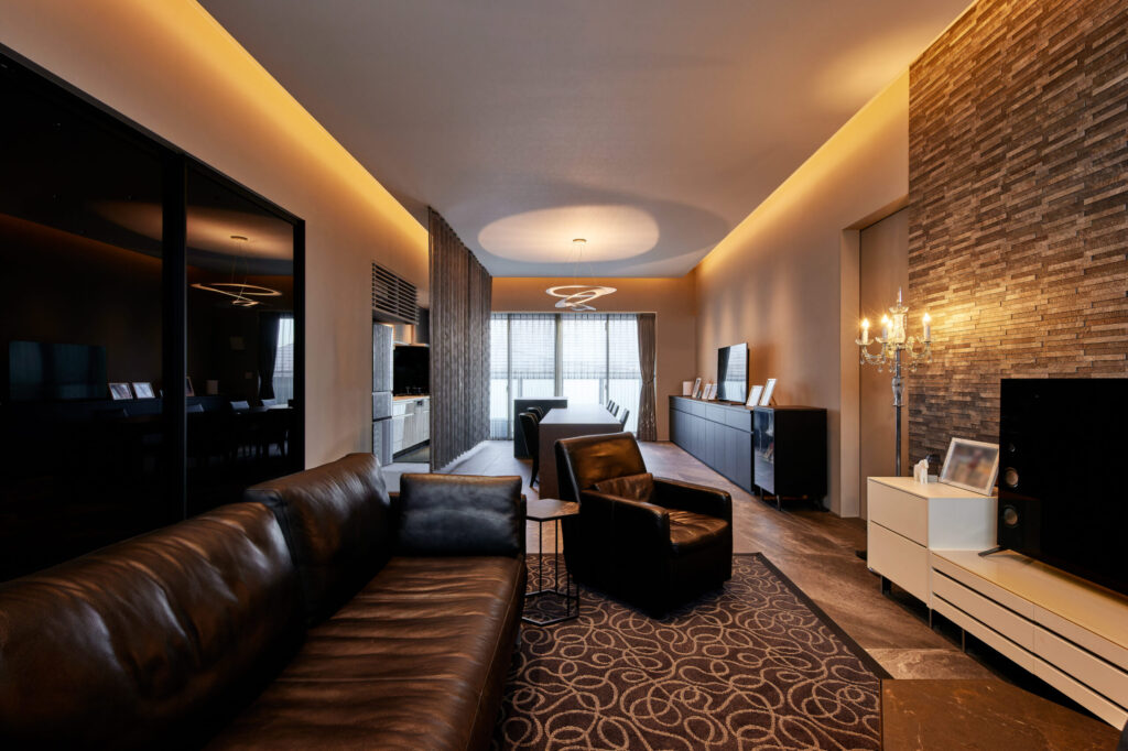 天井高さ3m以上の贅沢な開放感を味わえるLDK。天井四方に配置した間接照明が、エグゼクティブスイートルームのような空間を演出しています。