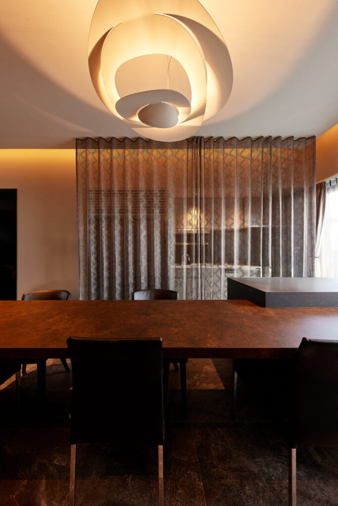 モールディングを施した折上げ天井や間接照明、⼤理⽯調のアクセントタイルを設え、格調⾼い空間をつくりあげています。