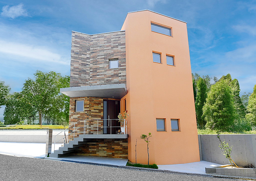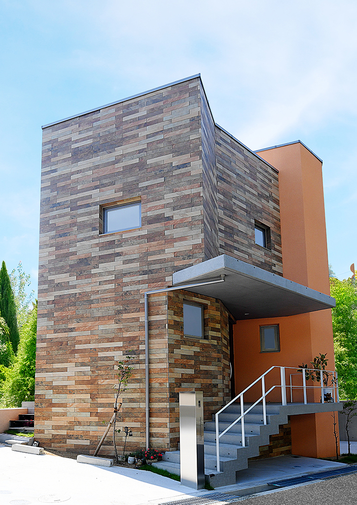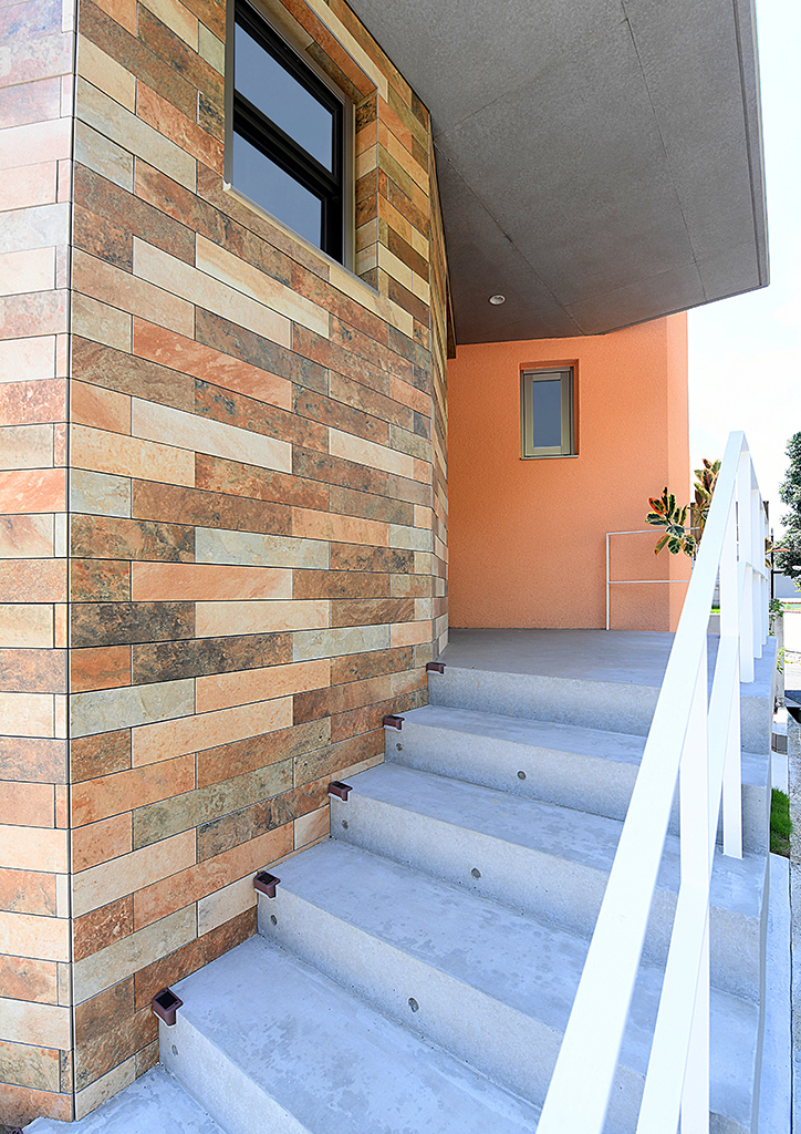 オレンジの外壁と暖色のタイルが印象的な外観。その美しさがより映えるように、打ちっぱなし仕上げのひさしとアプローチ階段を跳ね出しました。