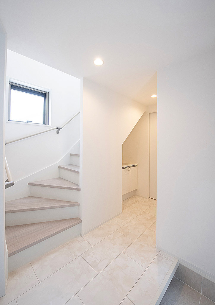 カラフルな外観から一転、内側は白を基調としたシンプルな設えです。玄関框下には靴が収納できるよう、ひと工夫しています。