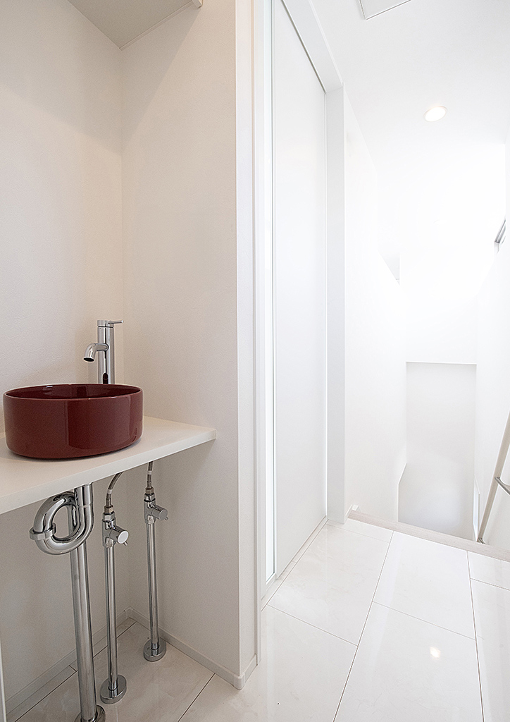 階段をのぼった先には、利便性の高い手洗いブースがスタイリッシュに配置されています。白い空間のアクセントになるよう、深みのある赤色のボウルを採用しました。