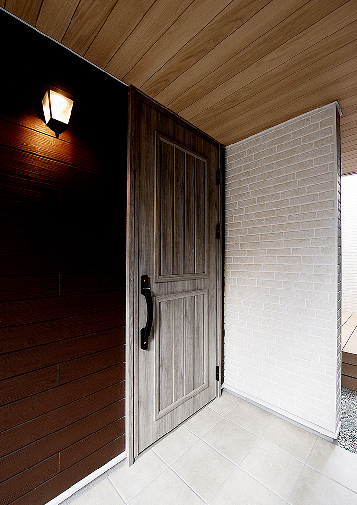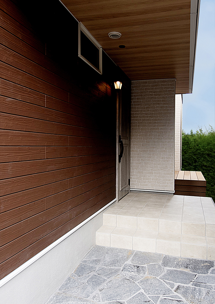 深い軒に包まれた玄関アプローチは、より質感を高める木目調軒天とブルーの天然石乱張りです。