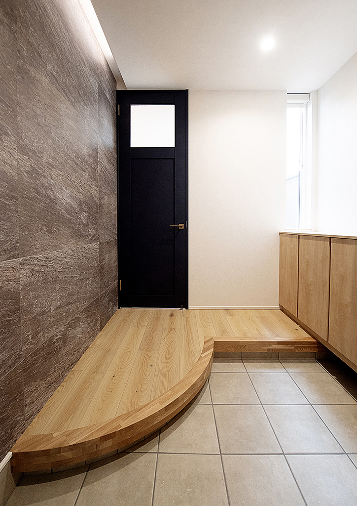 かっちりとしがちな玄関ホールも、玄関框にアール(曲線)を用い、やわらかさを加えています。