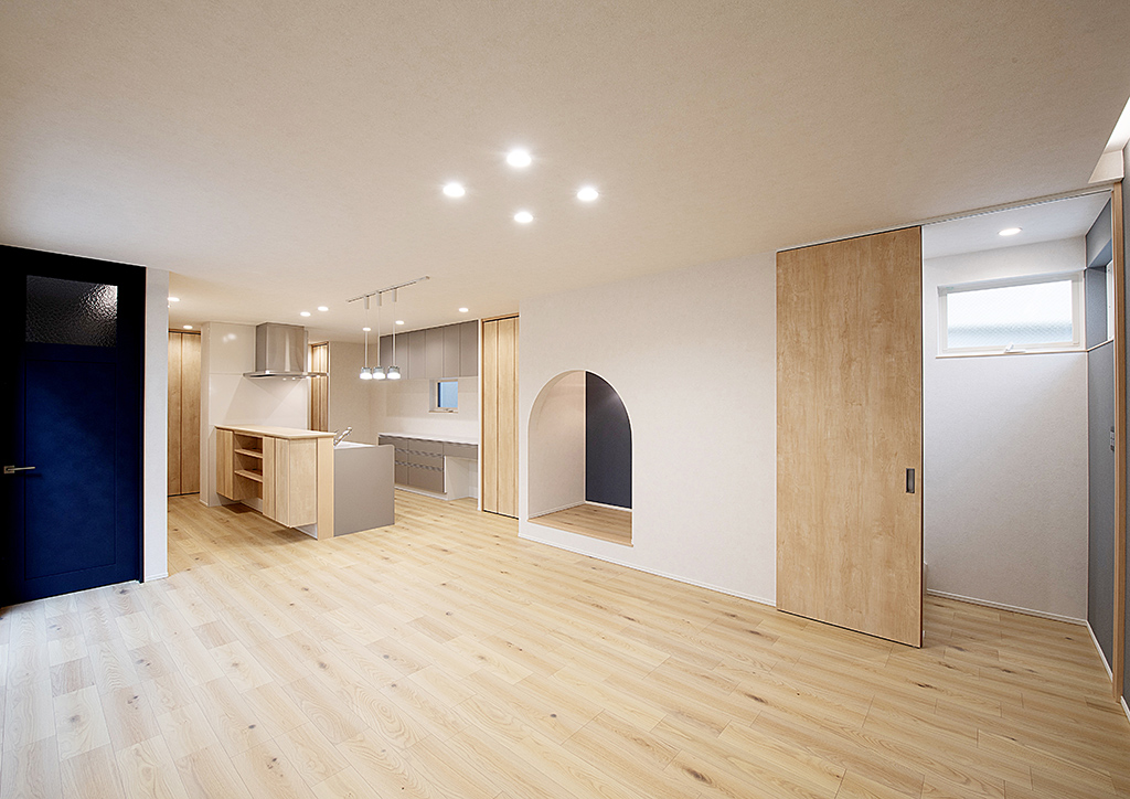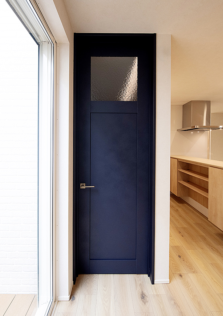 玄関ホールとLDKを繫ぐ青い扉は、白い壁とのコントラストがシックでありつつキュートさも持ち合わせています。