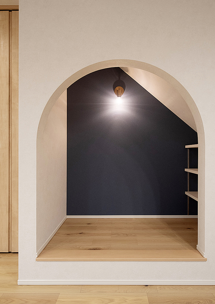 階段下にはアール(曲線)の入口が愛らしい「ヌック」と呼ばれる小部屋を配置しました。
