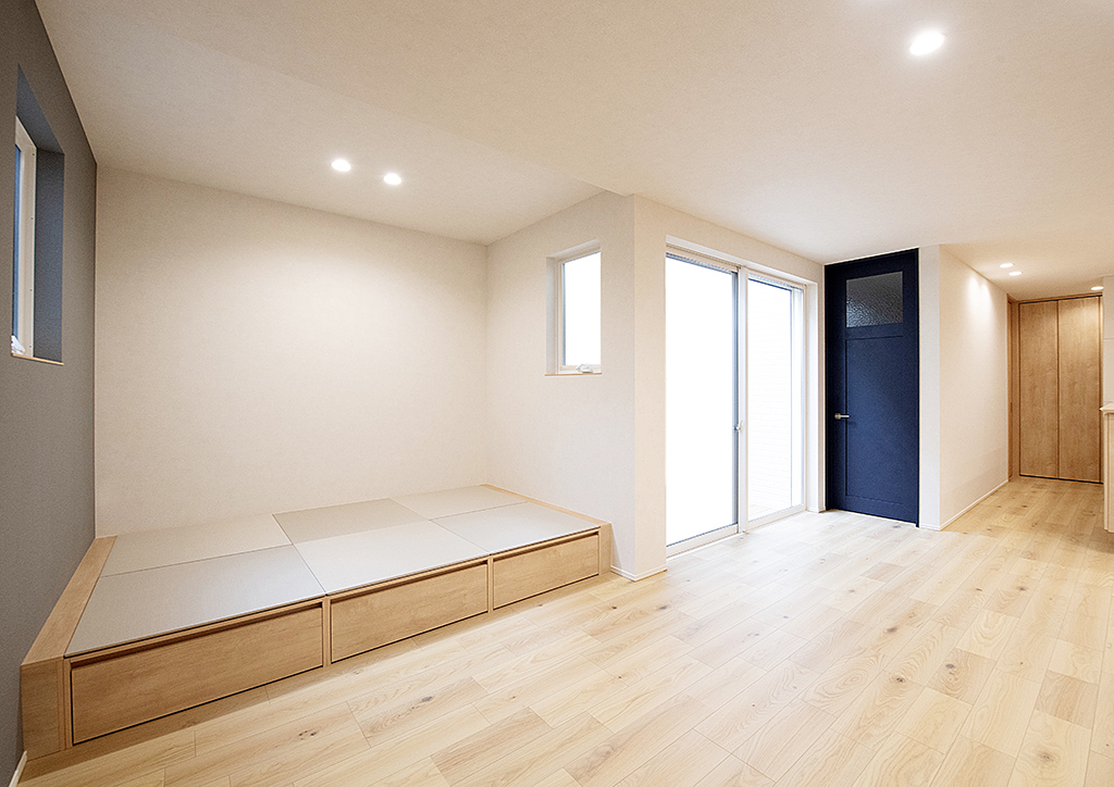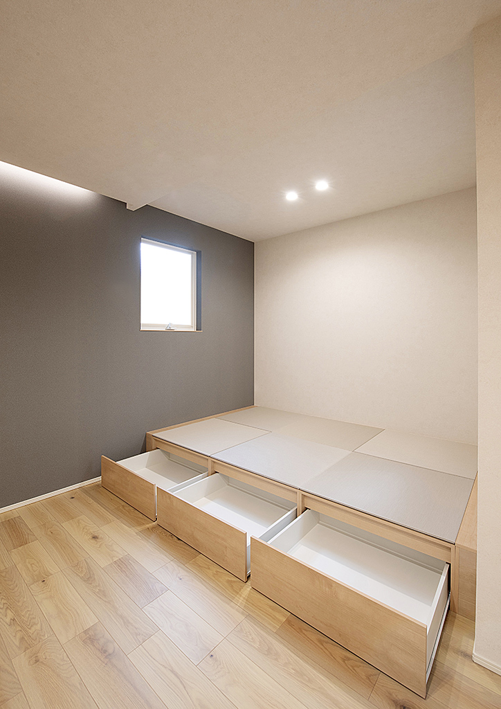 段差をつけた畳スペースには収納力も内包されています。