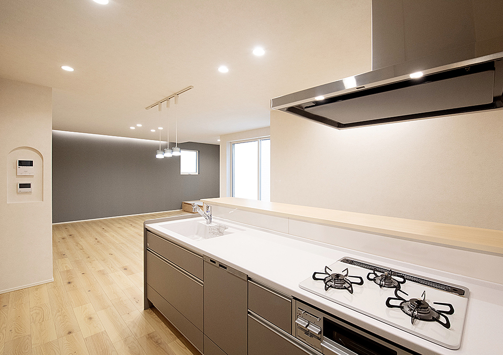 使い勝手のいい三ツ口コンロのキッチンにも、アール(曲線)を活かしたリモコンニッチで遊び心を加えています。