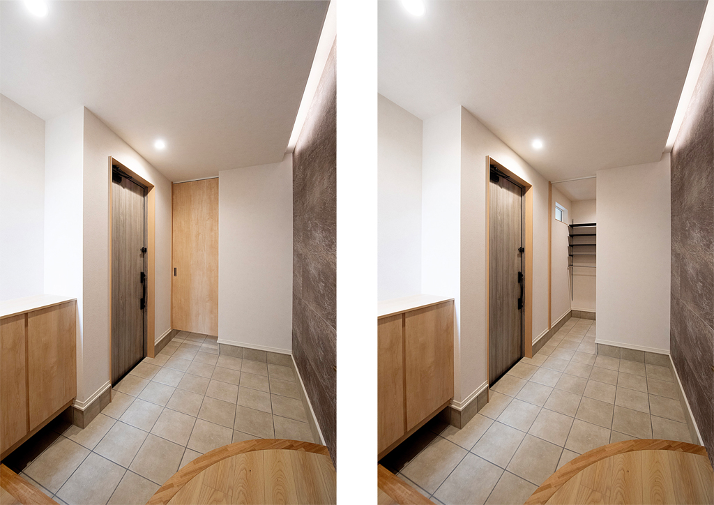 玄関ホールから中への動線は「お客様用」以外にもう一つ、使い勝手の良い「家族用」を設けました。