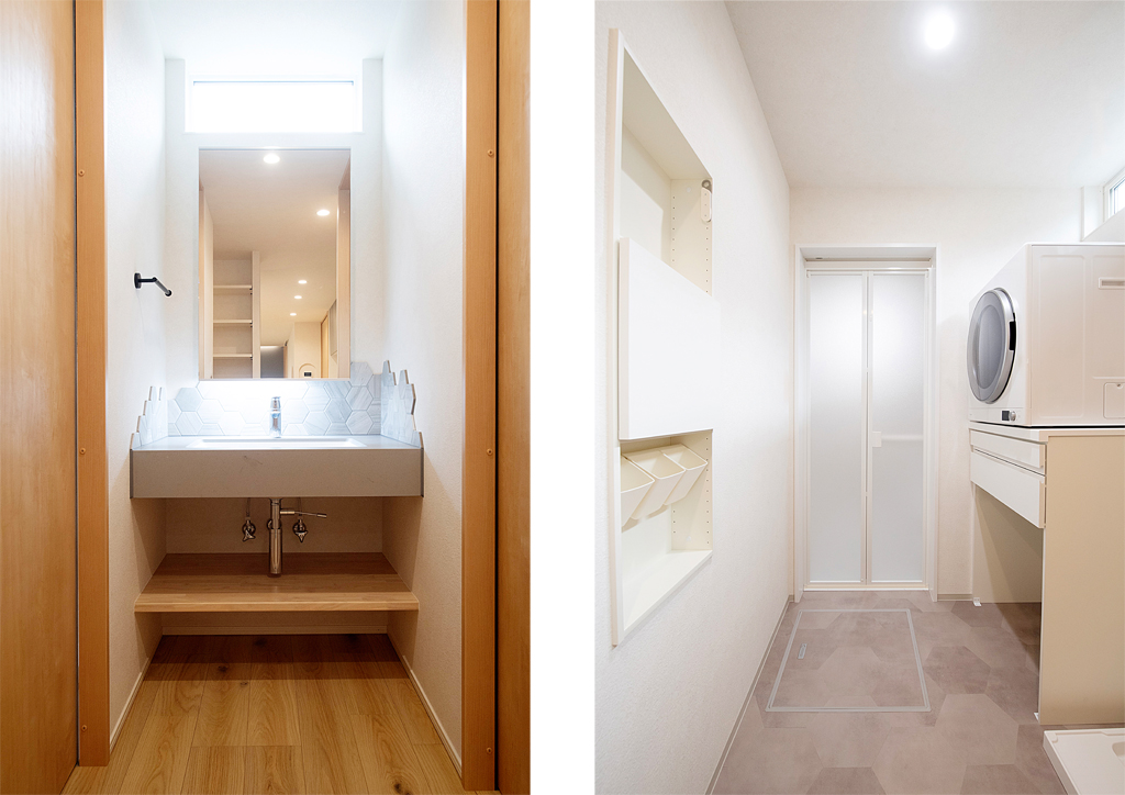 洗面にはアクセントとしてヘキサゴンタイルを貼りました。