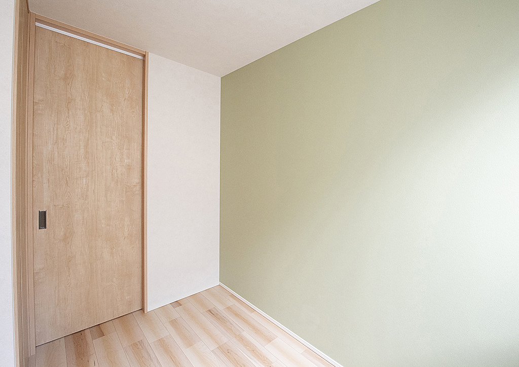 子ども部屋には明るいグリーンのアクセント壁を施しました。