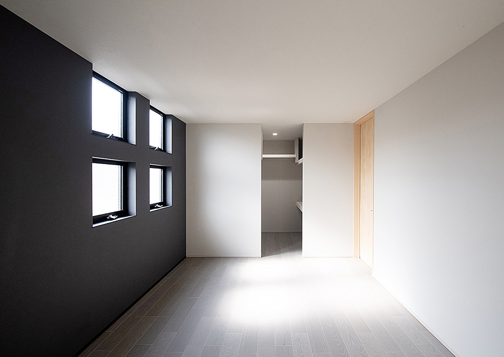 主寝室にはダークグレーのアクセント壁を配しました。