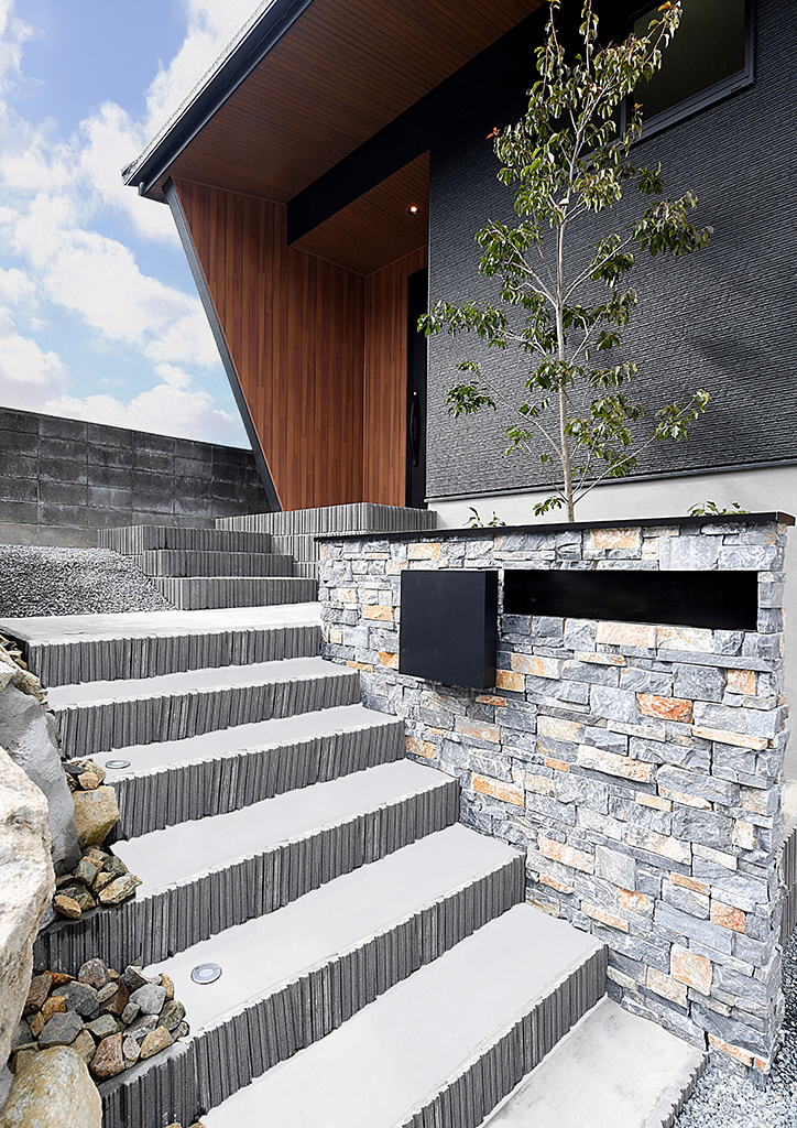 黒色を主とした外壁に、重くなりすぎないように木の素材感をアクセントに。また、石の風合いを活かした門柱とデッキの木製目隠しを利用して高基礎の間延び感を緩和させ、美しく整えました。