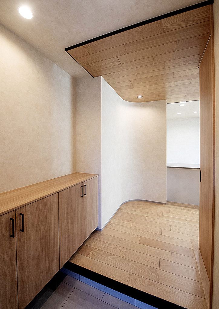 扉を開けると、白とオークの穏やかな玄関ホール。正面にあるアールが印象的な壁が中へと迎え入れてくれます。アールの壁に沿って進むと、そのまま広々とした空間につながります。