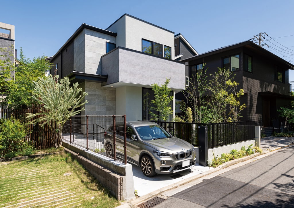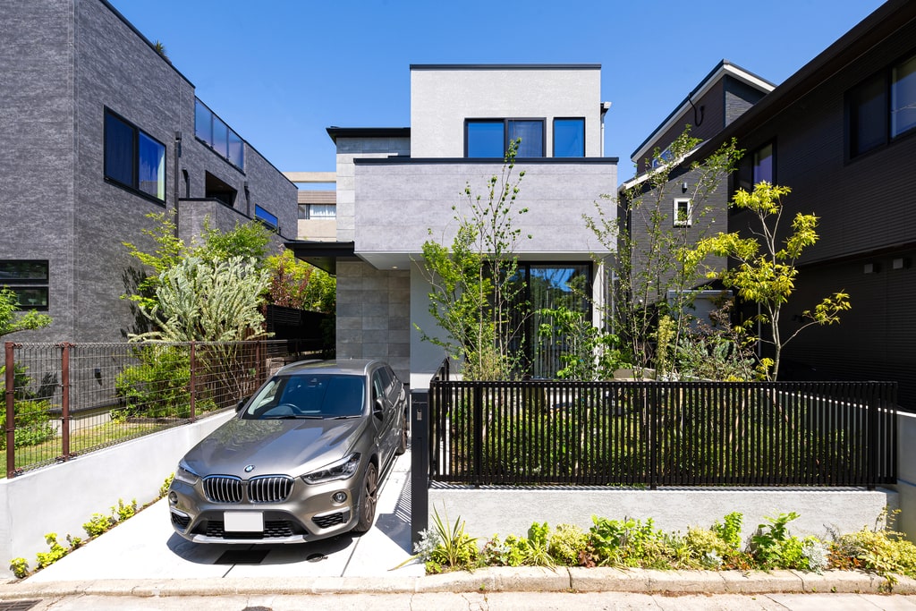 庭を彩る植栽は、シックな外観に合うものを選びました。グリーンだけではなく、グレーがかった色合いのものも採用しています。