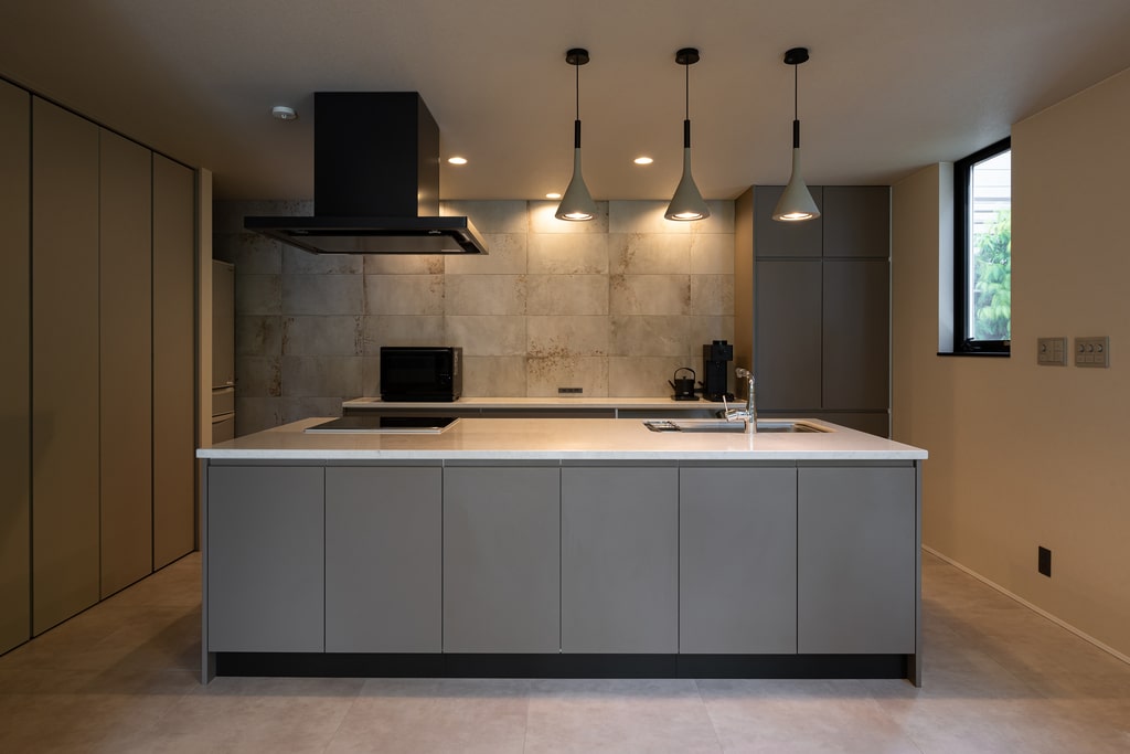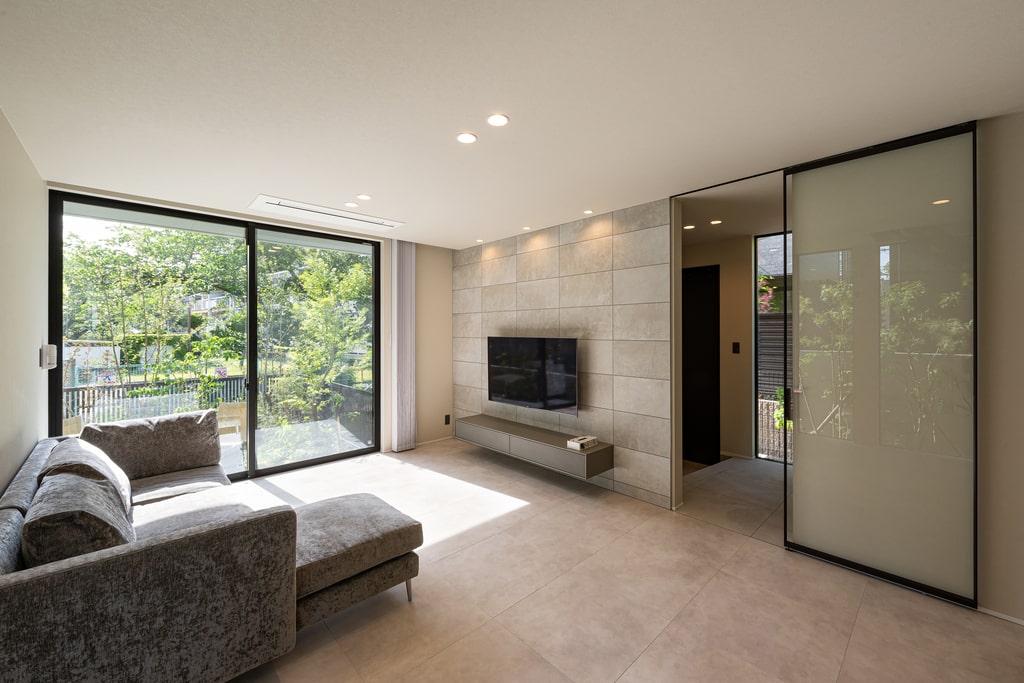 印象的な大判タイルは、海外インテリアを意識して取り入れています。