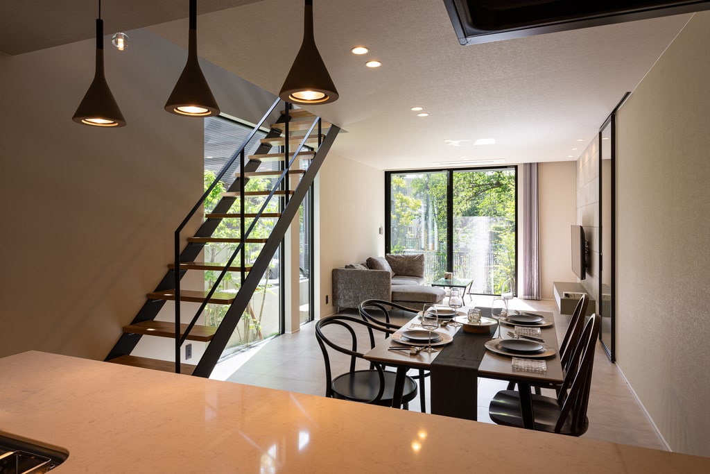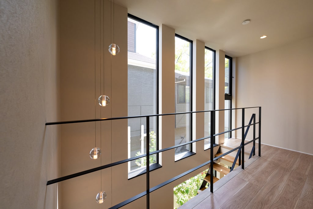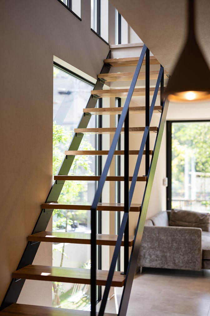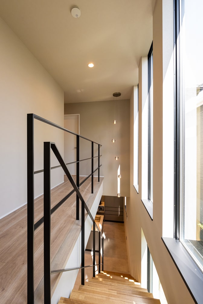 吹き抜けとシースルー階段を合わせることで、2階の窓から差し込む自然光が1階にも降り注ぎます。