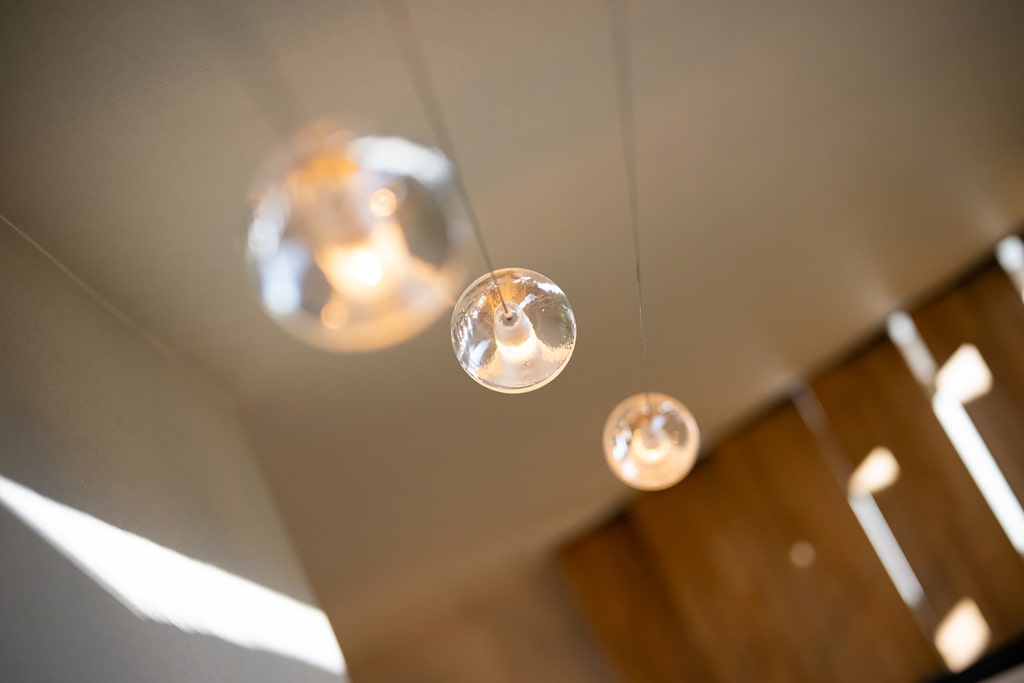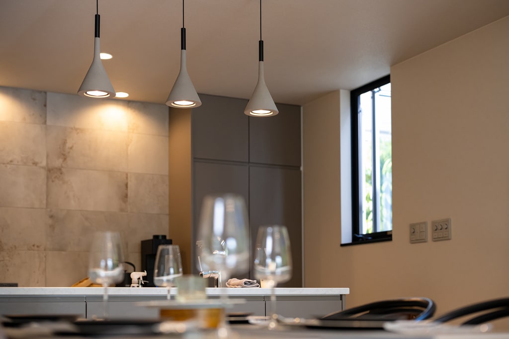 施主様こだわりのペンダントライトは、カナダの照明ブランド BOCCI(ボッチ)の14Series。吹き抜けの空間を華やかに演出しています。