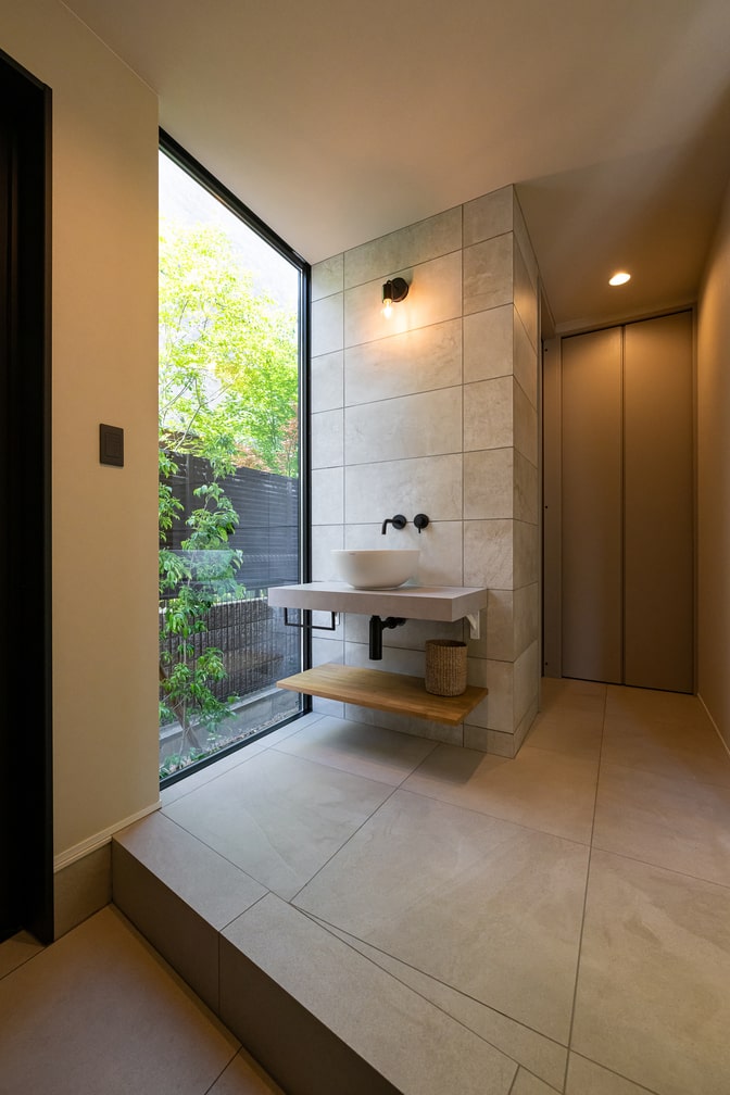 玄関のコンパクト洗面は、壁付け水栓を採用してすっきりと仕上げました。こちらの壁にも大判タイルを使用しています。