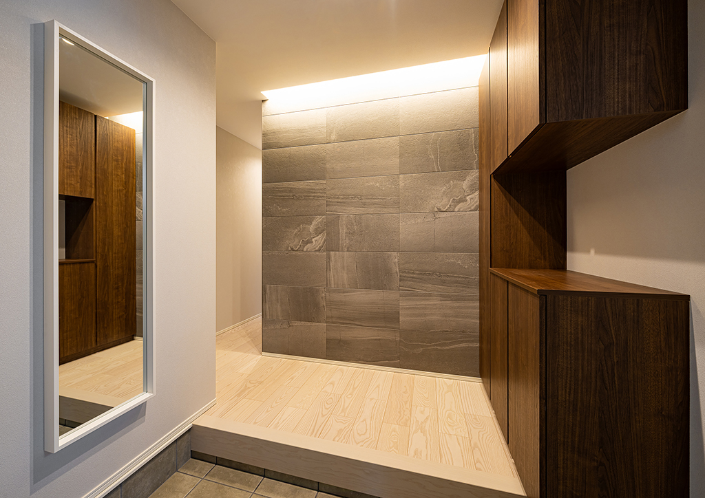 道路に面さない玄関は、外部からのプライバシーやゆとりの確保に効果があります。