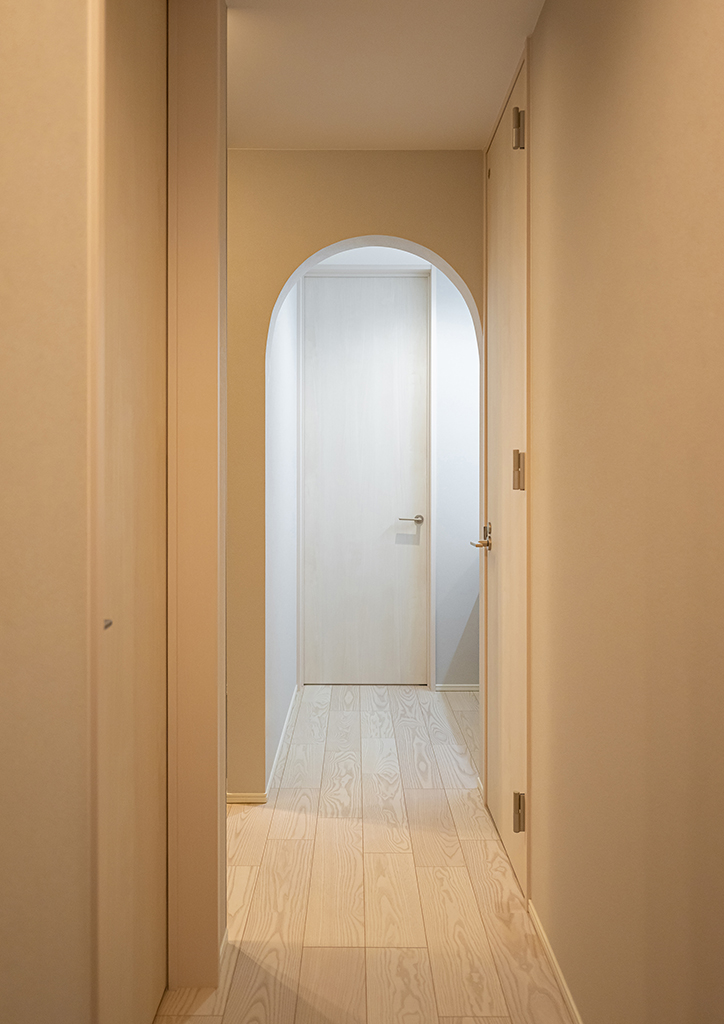 扉の代わりにアーチ型の垂れ壁で仕切ることで、ホールから洗面スペースへ自然につながる、やわらかな雰囲気を演出しています。