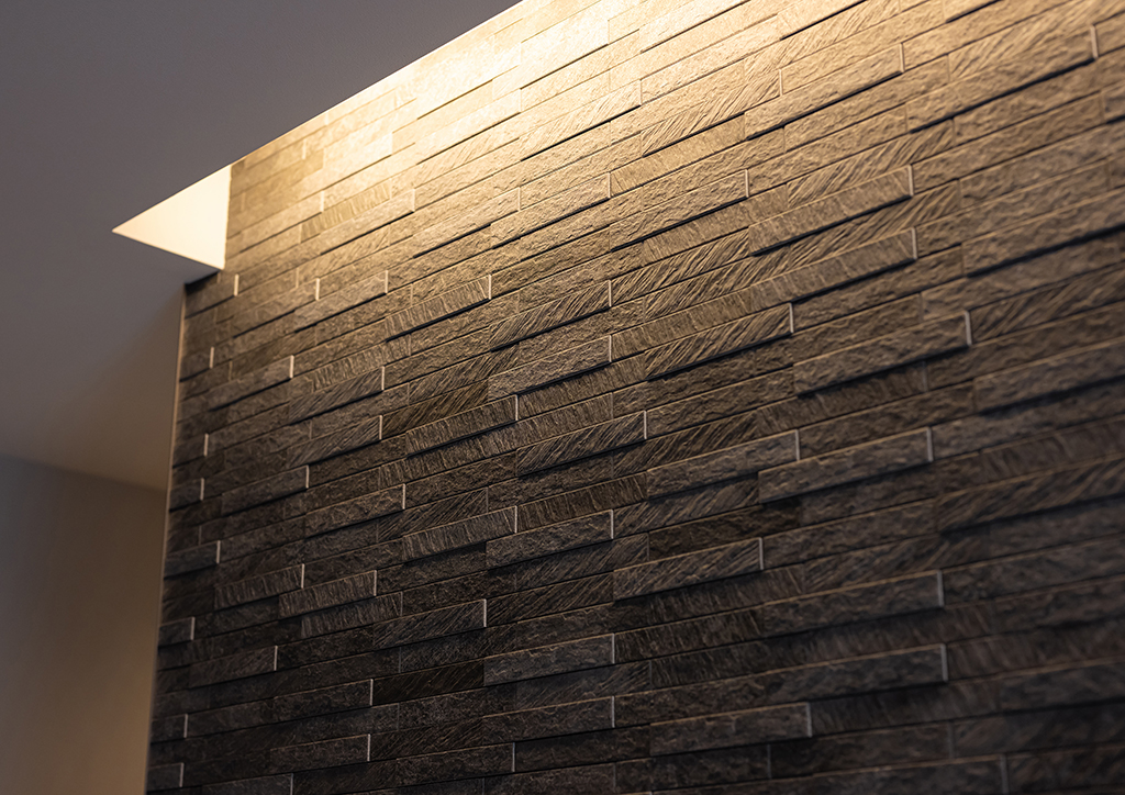 アクセントのエコカラットの風合いが活きるよう、間接照明をあしらいました。
