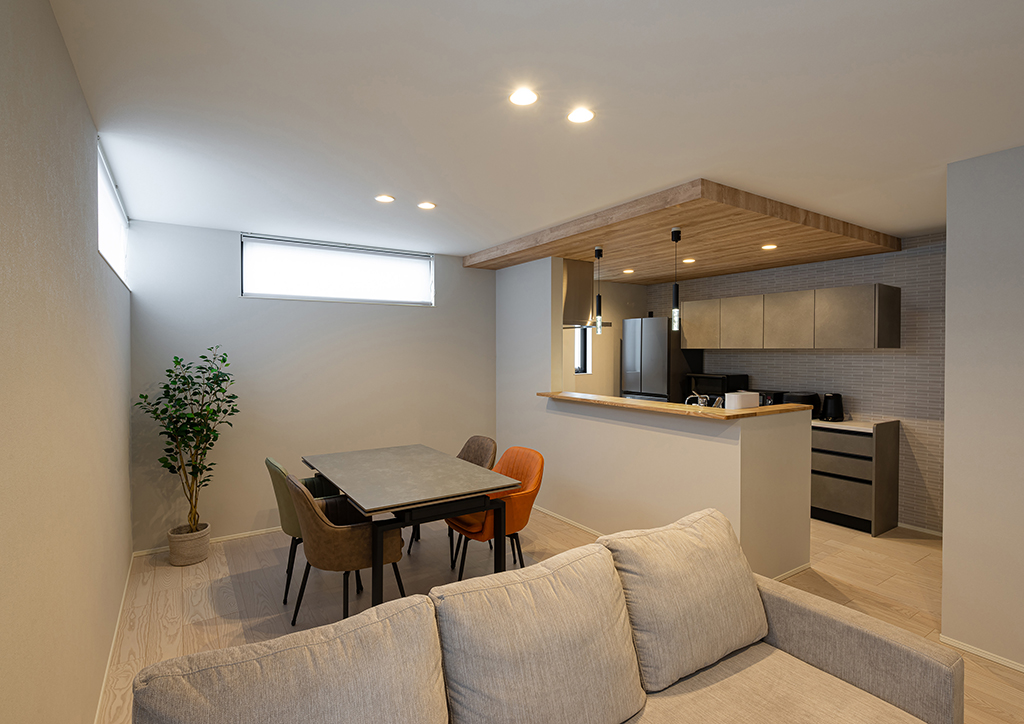 外からの視線は避けて、光はしっかり取り入れる。落ち着いた淡いグレーの壁に優しい木調の素材を合わせる。調和を大切にした空間です。