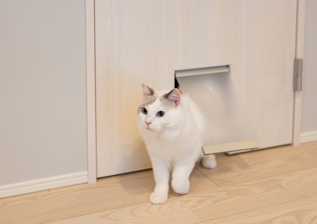 思い思いにくつろげるよう、快適に行き来できるペットドアは、猫のお部屋だけでなく、寝室にも設置しました。