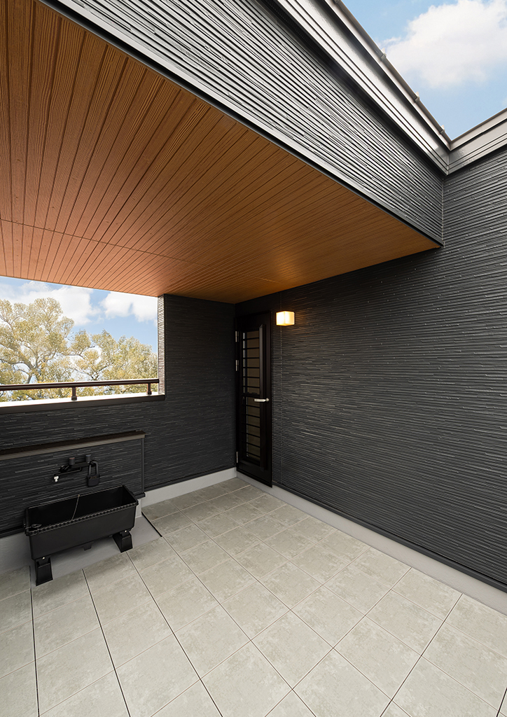 3階にはお部屋の他に充実のバルコニーも。少し椅子置いて寛げたらというご要望に合わせて、意匠性の高い木目調の軒天を採用した屋根付きスペースを設けました。